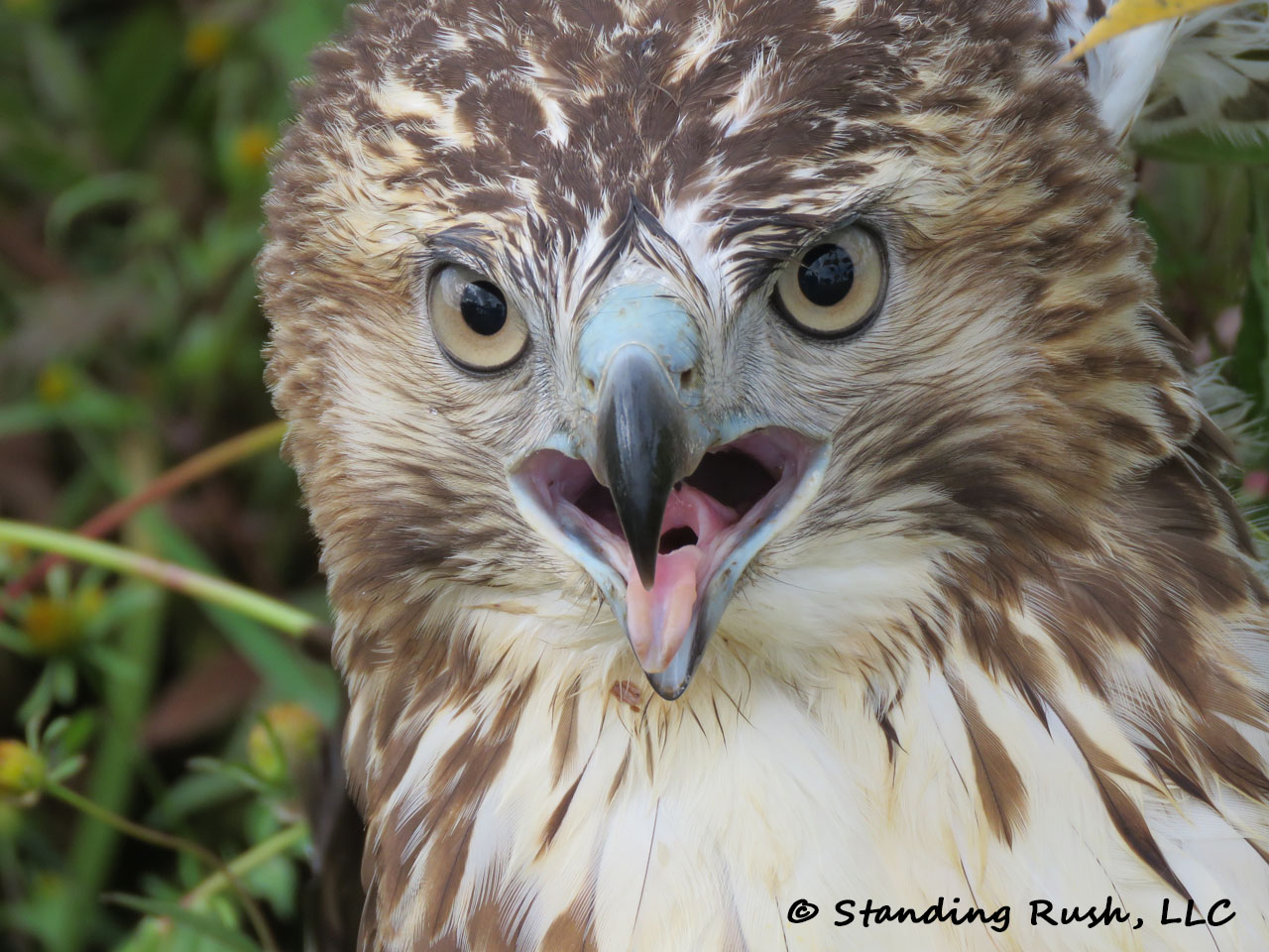 | The thick mass of hibiscus, smartweed, and beggars tick may have provided a soft landing, but the young hawk almost looked sheepish trying to regain its balance, its composure, and its meal |